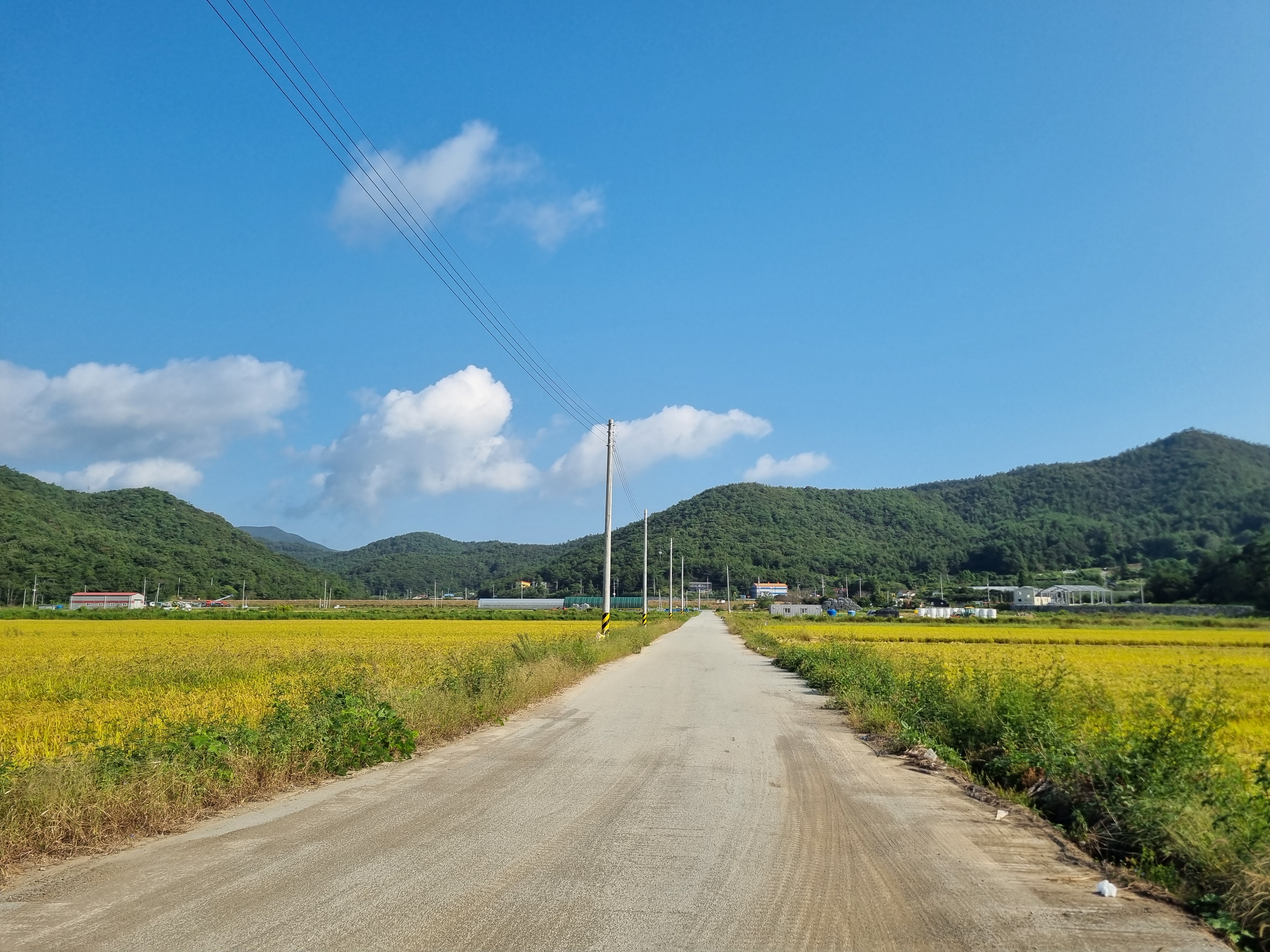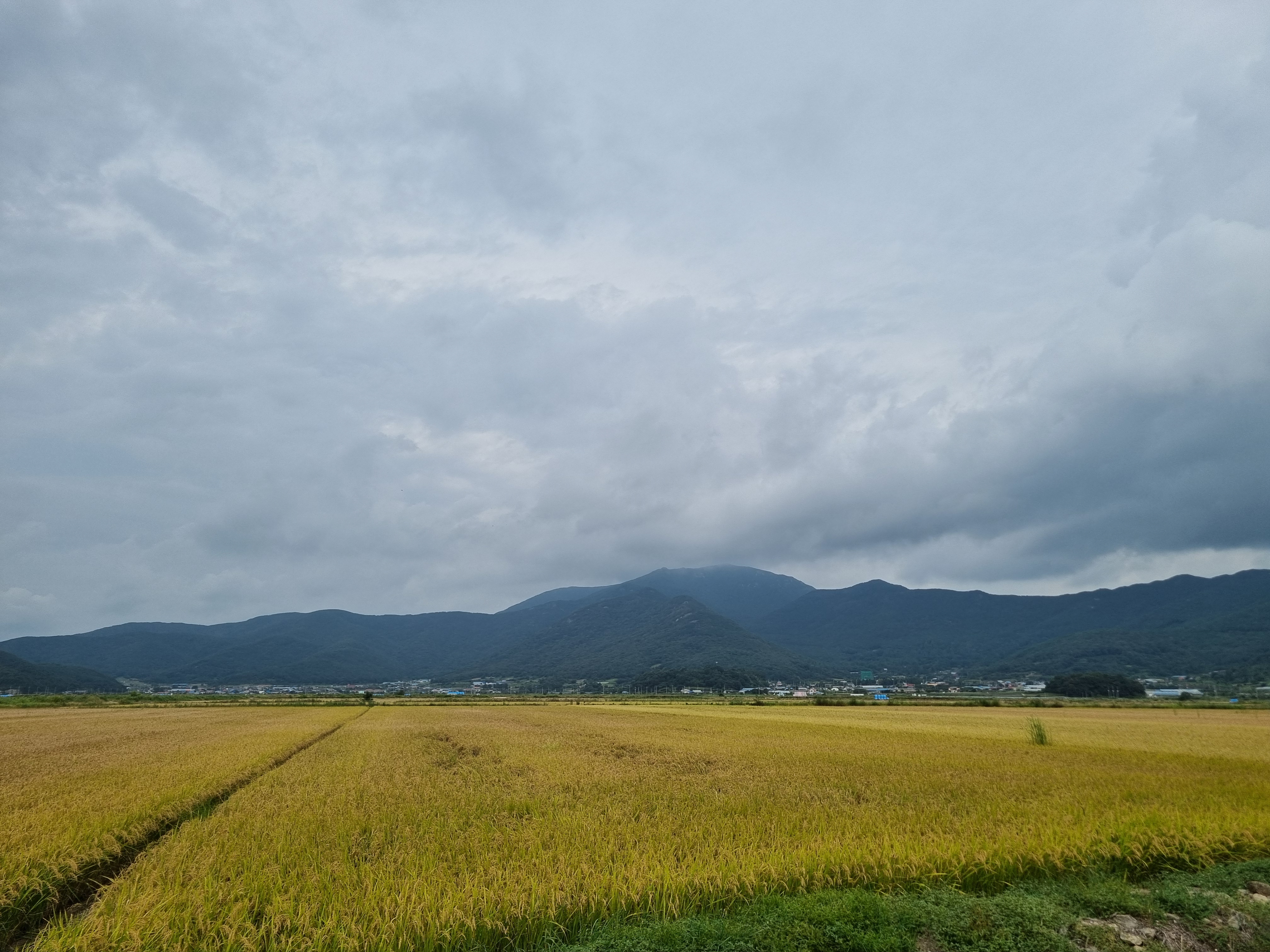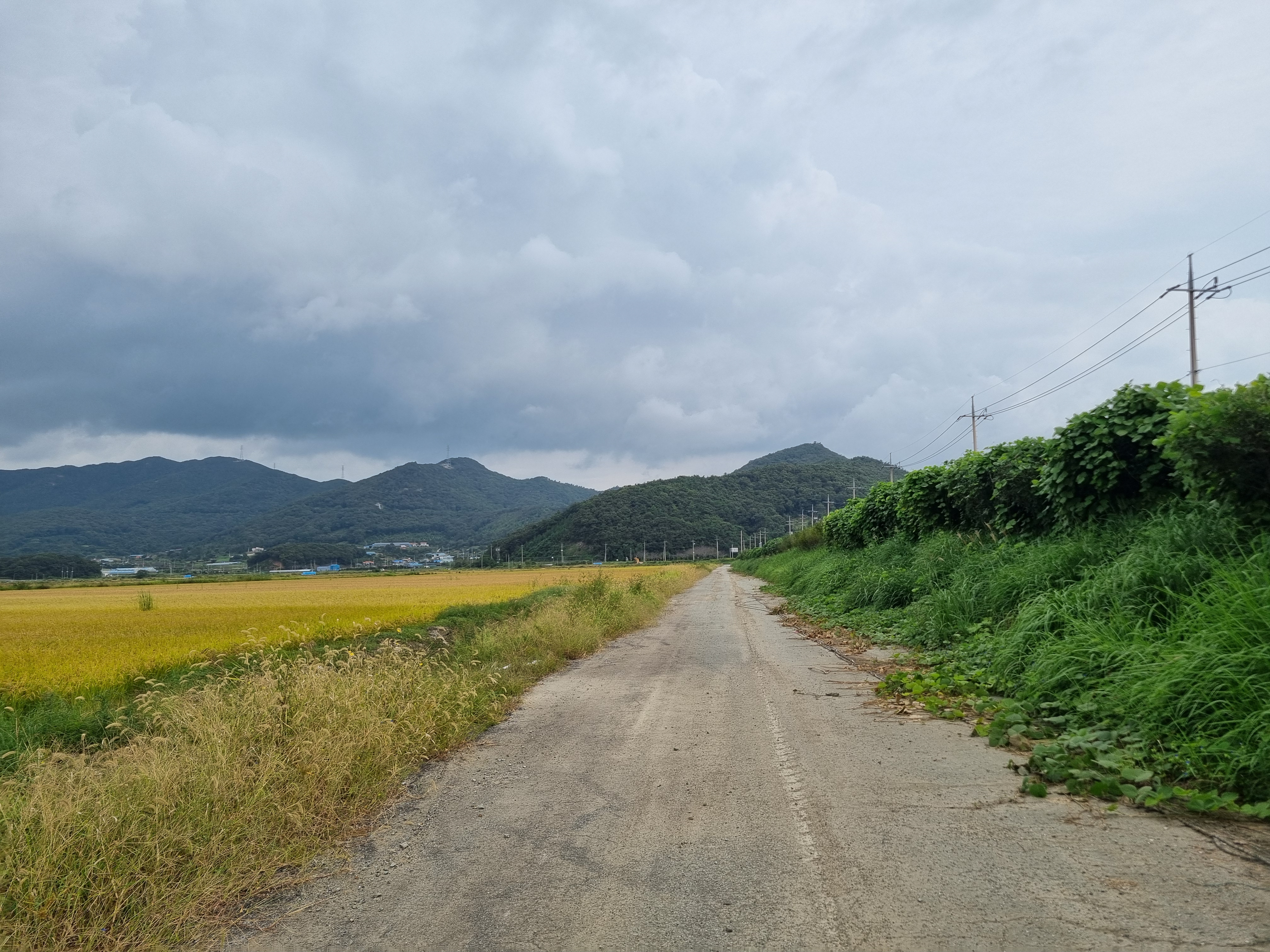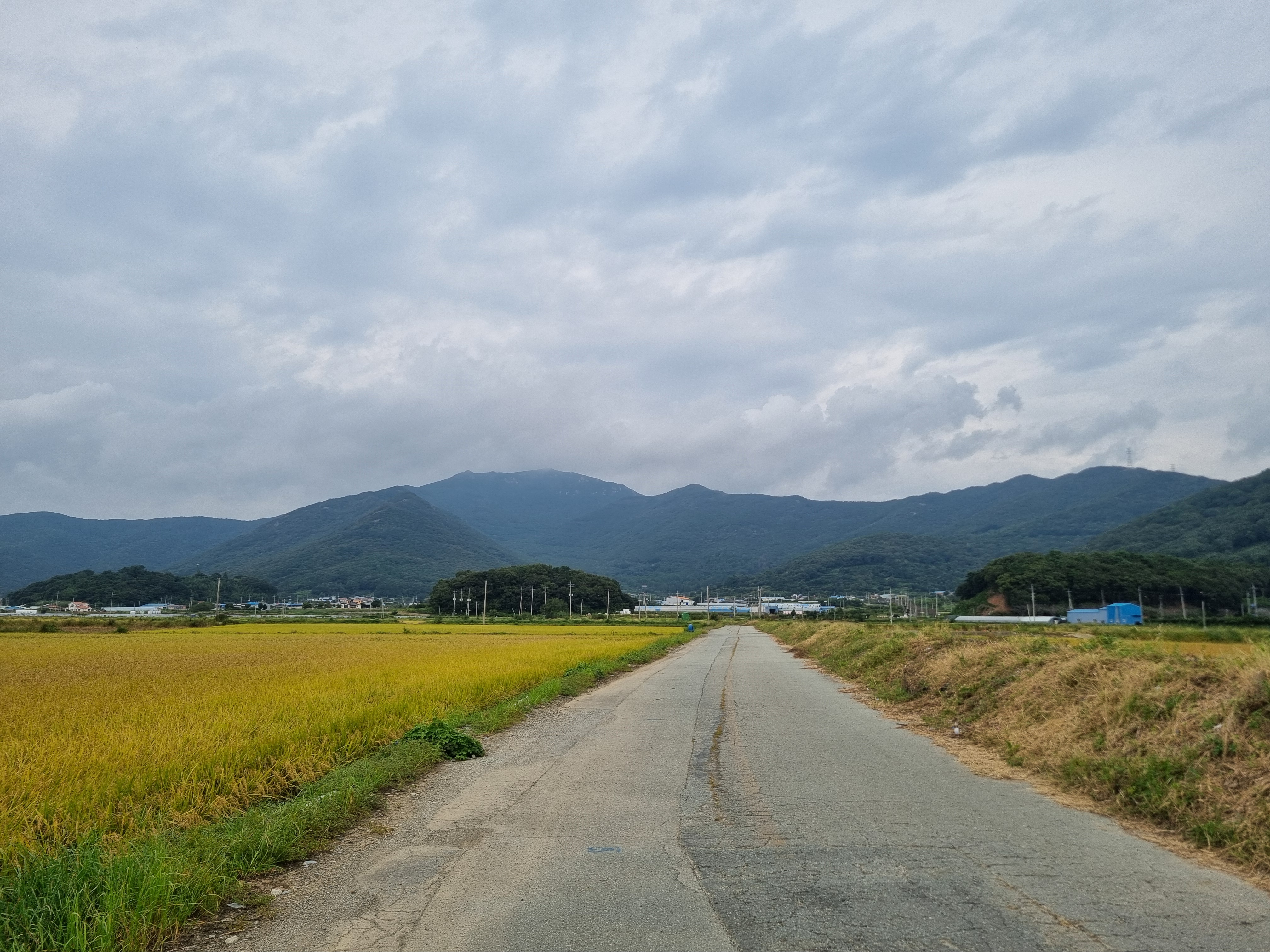 들판에는 지 몸값이 떨어진 줄도 모르고 누렇게 익어가는 나락과 88코스에 올라갈 완도 상황산을 바라봅니다↓