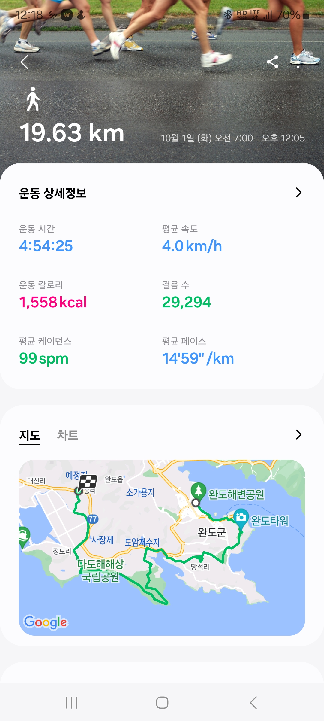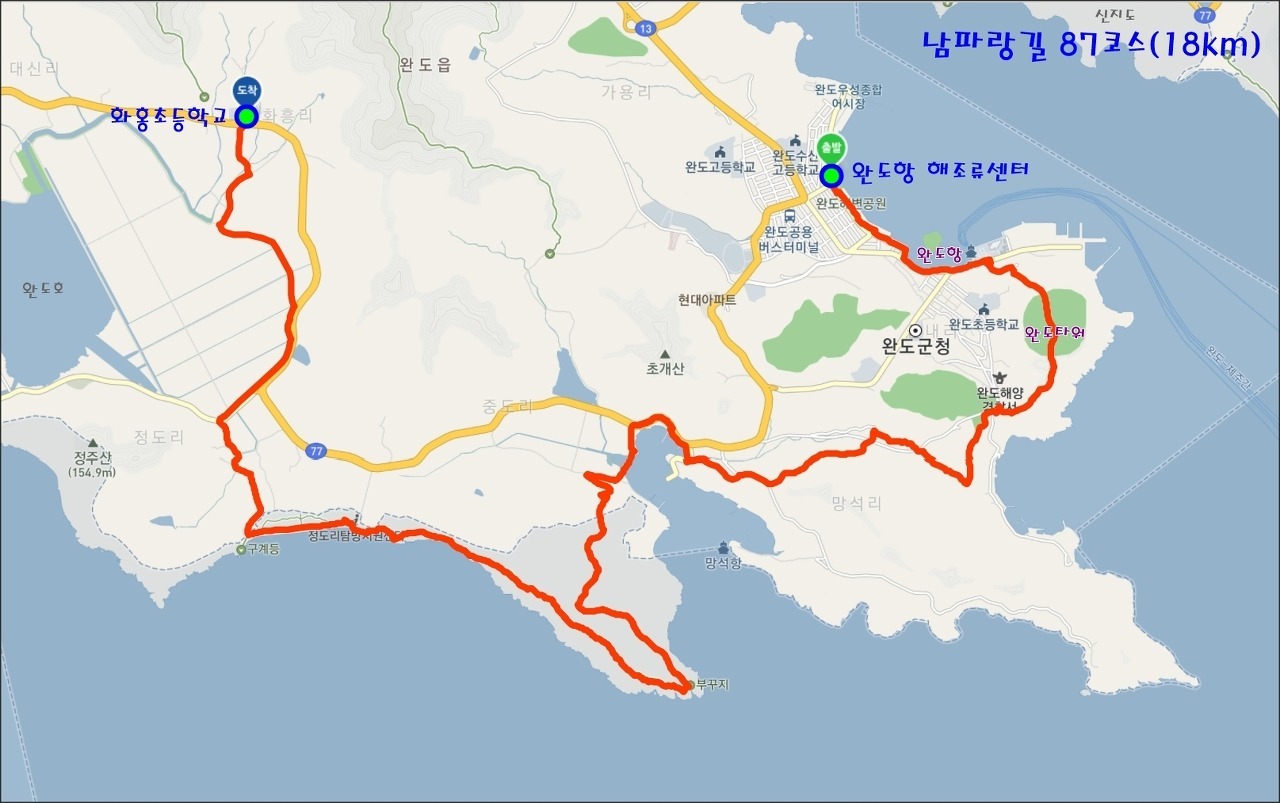 걸었던 거리는:완도항해조류센터 - 화흥초등학교 (19.63km)